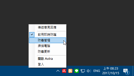 第2步 安裝好軟體後,可以從右下角的小紅傘圖示點一下滑鼠右鍵再按「防毒管理」,開啟軟體主視窗。