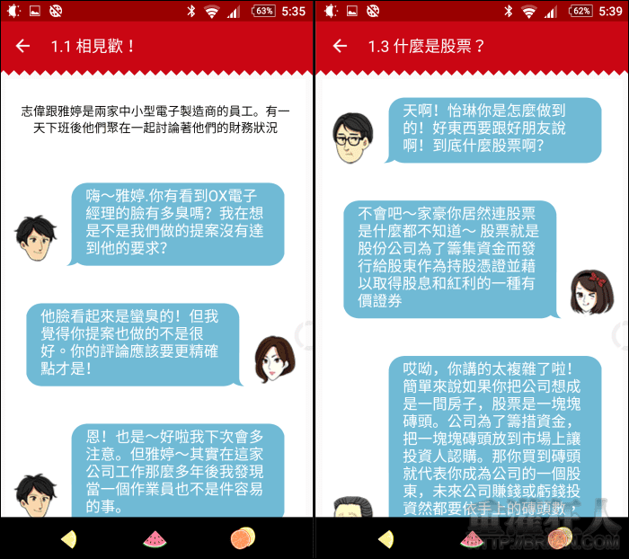 在程式中的「小學堂」透過趣味的角色對話方式,帶著初學者們了解股票、股市以及投資方式……等基本知識,然後每天都會選出一支股票,讓所有的使用者進行練習,預測該股票明天將會上漲還是下跌,練習分析各方資訊,培養股價動向的觀察力。