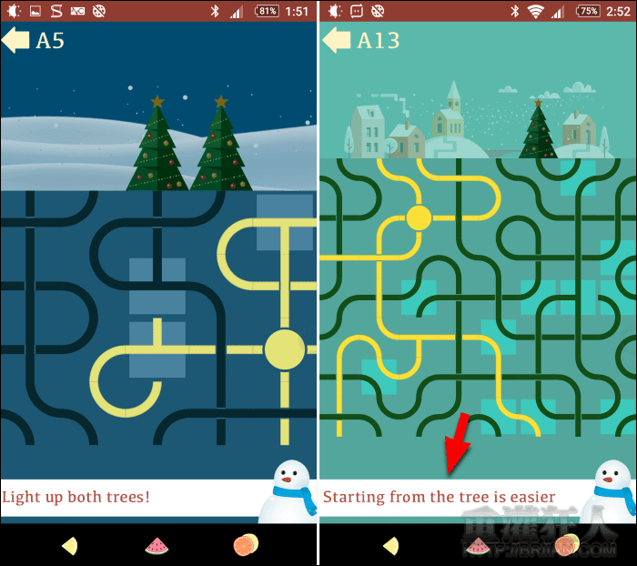 也會有需要同時點亮多顆樹的關卡。下方的雪人偶爾會提供一些小技巧哦!